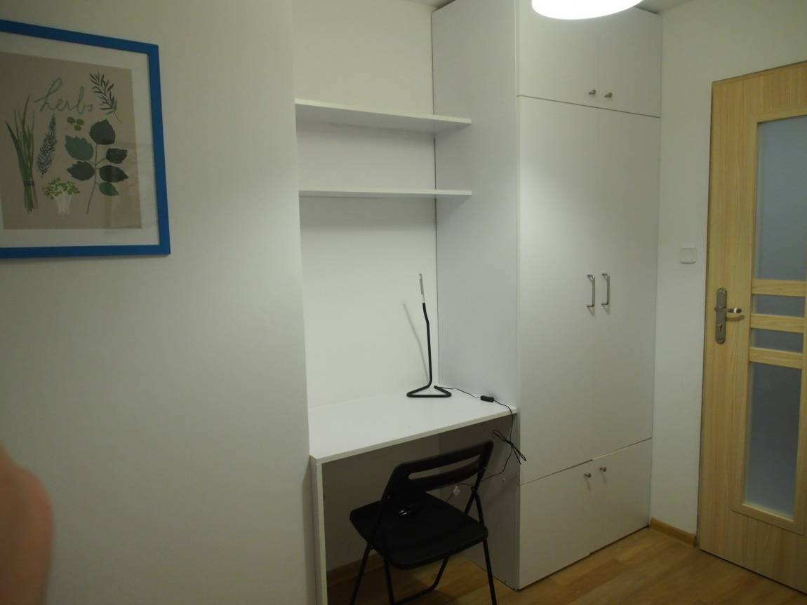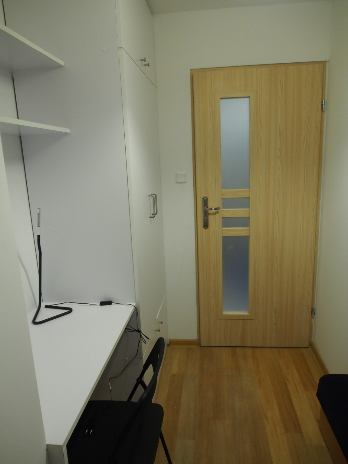 Pokój jest w pełni umeblowany - łóżko, szafa, półki, biurko, krzesło, lampka. Pokój jest zamykany na klucz.
