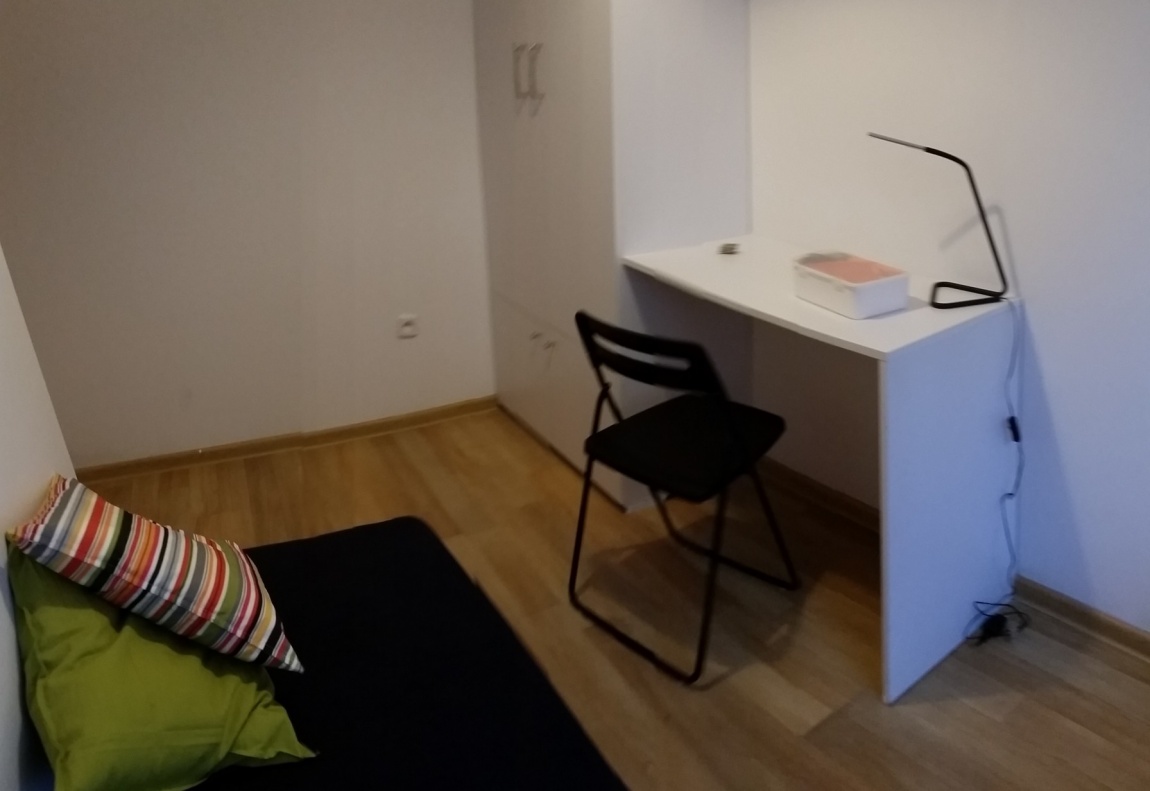 Pokój jest w pełni umeblowany - łóżko, szafa, półki, biurko, krzesło, lampka. Pokój jest zamykany na klucz.