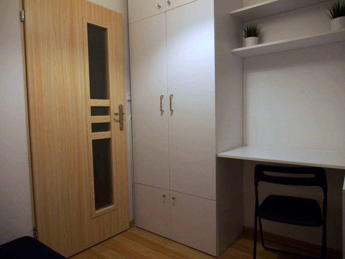 Pokój jest w pełni umeblowany - łóżko, szafa, półki, biurko, krzesło, lampka. Pokój jest zamykany na klucz.